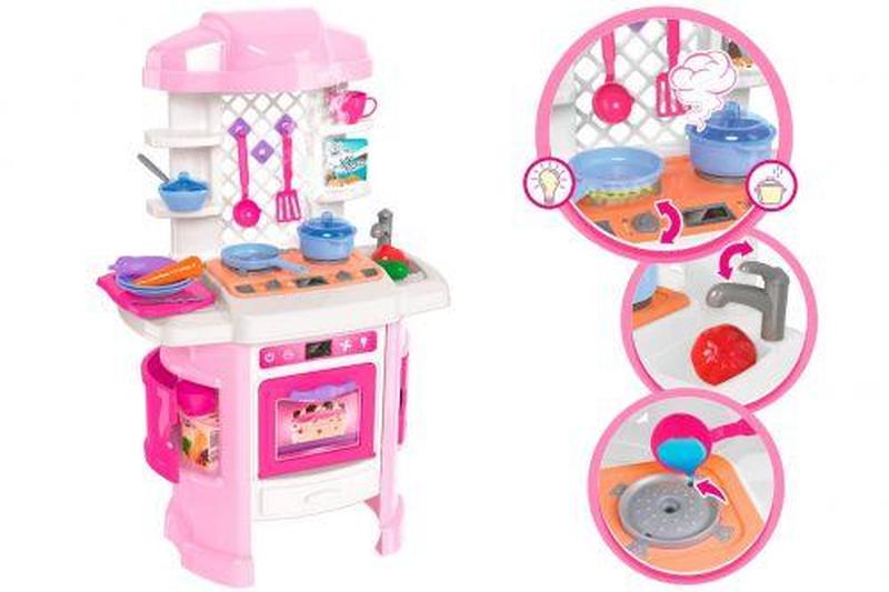 Ігровий набір "Кухня" буде цікавим подарунком дитині. Являє собою конструкцію зі столиком, плитою, мийкою, духовкою і поличками для посуду. Так само, в наборі є: продукти (6 шт.), Доточка (1 шт.), Каструлька (1 шт.), Сковорідка (1 шт.), Чашечка з блюдцем (2 шт.), Тарілочка (2 шт.) , кухонні (4 шт.), і столові (6 шт.) прилади. Є світлові і звукові ефекти (світяться елементи на плиті і духовці, шум, звук кипіння). Коли в каструльці що то готується - йде пар (холодний і повністю безпечний для дитини). Розмір конструкції в зібраному вигляді - 51х81х30 см. Виконана з якісного пластику. Для дітей від 3-х років. Упаковка: Коробка Колір: Різнобарвний Тип ел-тів живлення: Батарейки АА Кількість ел-тів живлення: 3 Ел-ти живлення в комплекті: Ні Вага з упаковкою: 3173 г Габарити в упаковці: 61 x 48 x 20 см Країна виробник: Україна Матеріал: Пластик Комплектація: Елементи конструкції, дощечка, каструля з кришкою, сковорідка, чашка (2 шт.), Блюдце (2 шт.), Ложка (2шт.), Вилка (2шт.), Тарілка - 2шт., Цукорниця з кришкою, вилка велика, шумівка , лопатка, черпак, продукти (огірок, морква, баклажан, помідор), коробочка (2 шт.), губка.