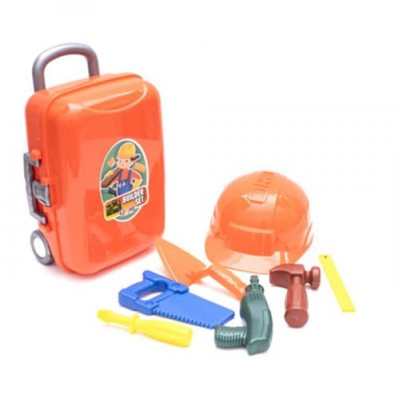 Набор пластиковых строительных инструментов в удобном чемоданчике с колесиками и ручкой. В наборе есть каска (диаметр - 19 см), пила, отвертка, молоток, дрель, линейка и лопатка. Набор выполнен из прочных и безопасных материалов, для детей от 3-х лет. _