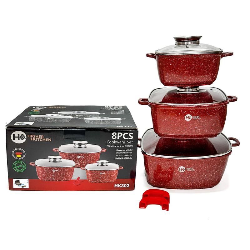 Посуд «Higher Kitchen». Набір з 8 предметів з антипригарним покриттям з граніту та скляними кришками з отвором для пари. Індукційне дно, тришарове антипригарне покриття, квадратна форма. Зручні термостійкі литі ручки з двох боків. Виготовлена з високоякісного литого алюмінію. Підходить для всіх типів плит. Можна мити в посудомийній машині. В наборі: Котел з кришкою Ø 20х9см / 2.5 л. Котел з кришкою Ø 24х11.см / 4.5 л. Котел з кришкою Ø 28х12см / 6.7 л. 2 силіконові накладки. Упаковка – коробка.