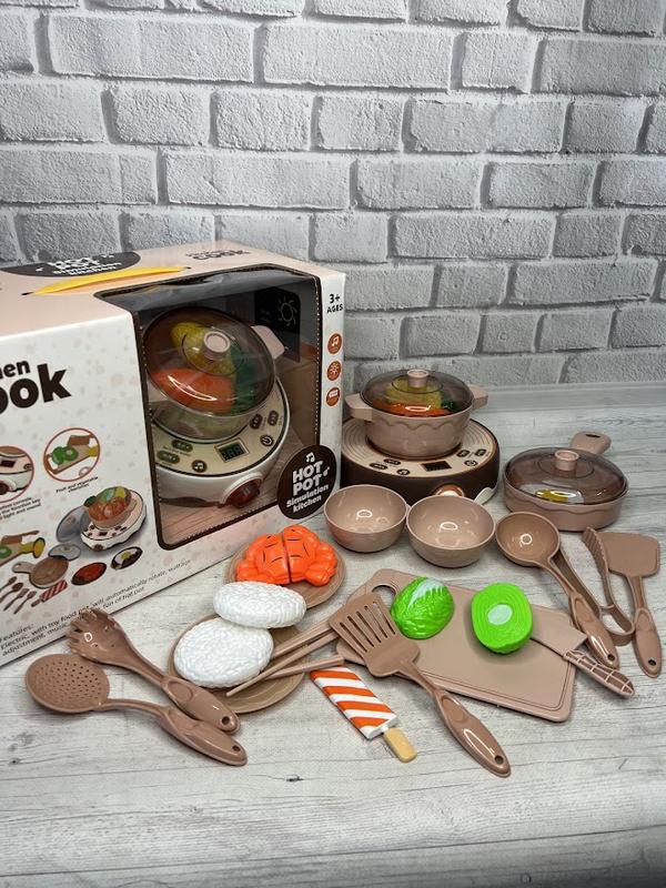Стильная игрушечная плитка станет лучшим помощником на детской кухне. С ее помощью можно не только приготовить блюда ресторанного уровня, но и воссоздать процесс готовки – после включения в центре пательные или кастрюли будет вращаться нижняя часть, что будет воспроизводить эффект перемешивания продуктов. А веселая готовка будет сопровождаться яркой подсветкой и динамичными мелодиями, которые помогут сосредоточиться на знакомстве с увлекательной профессией повара. Особенности: - набор состоит из плитки, кастрюли, пательные, набора лопаток, доски, посуды, продуктов на липучках и готовых составляющих для некоторых блюд; - кастрюля и патель имеют вращающиеся части при использовании плитки; - доска также имеет часть с формочками, с помощью которых можно создать различные продукты; - во время работы плитка подсвечивается и воспроизводит динамичные мелодии; - регулируется мощность работы плиты; - световые и звуковые эффекты работают от 3-х батареек типа “АА” (не прилагаются); - набор изготовлен из качественного пластика, который является безопасным для здоровья ребенка. Размер упаковки 34*24*18 см