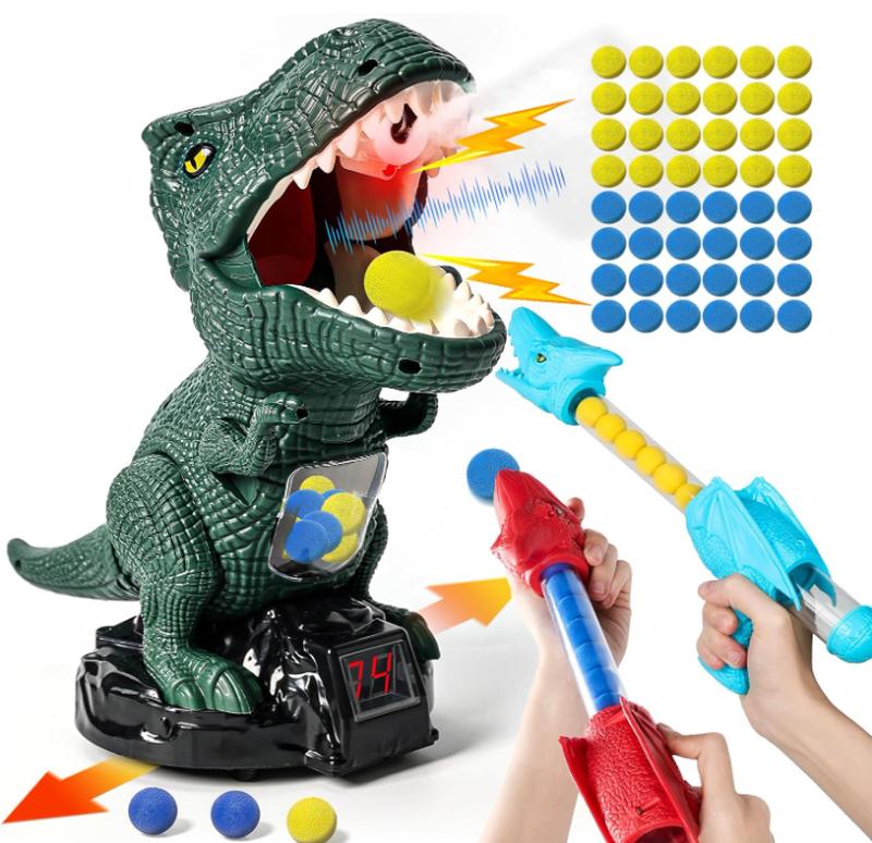 Детский ТИР, игра с мишенью "Динозавр", Ружье помповое 2шт. защитные очки и шарики. Интерактивная игра детский тир с мишенью динозавр 2 помповыми ружьями очками шариками светом звуком и таблом. - ### Реалистичные звуки: при попадании в цель ты услышишь рычание динозавра, которое создает атмосферу настоящей битвы! - ### Динамика игры: динозавр не только рычит, но и ездит, покоряя своим движением всех игроков! - ### Парогенератор: смотри, как он генерирует пар, добавляя еще больше азарта! - ### Подсветка табла: играй в любое время суток, ведь табло имеет яркую подсветку! - ### Надежные материалы: изготовлено из прочных материалов, которые выдержат все «приключения» твоего ребенка! - Метательная игра, в которой Вы должны попасть прямо в рот динозавру. Охота начинается сразу, как только у Вас в руках окажется пистолет. Стреляйте из пистолета поролоновыми пулями-шариками. Ребенок может соревноваться с друзьями на ловкость и прицел. Материал изделий полностью безопасный. Отвлекает от бесполезных гаджетов. Развивает ловкость рук, моторику и меткость. Играть можно дома и на улице. Вставьте в обойму пистолета поролоновые мячики. Разместите фигурку на удобную для Вас дистанцию. Цельтесь в язык и стреляйте! Выиграет тот, кто наберет больше очков. Комплектация включает: - ### мишень в виде динозавра; - ### 2 помповых пистолета; - ### 2 пары очков для защиты глаз; - ### пипетка для парового эффекта; - ### 2 пачки мягких снарядов. (24шт)