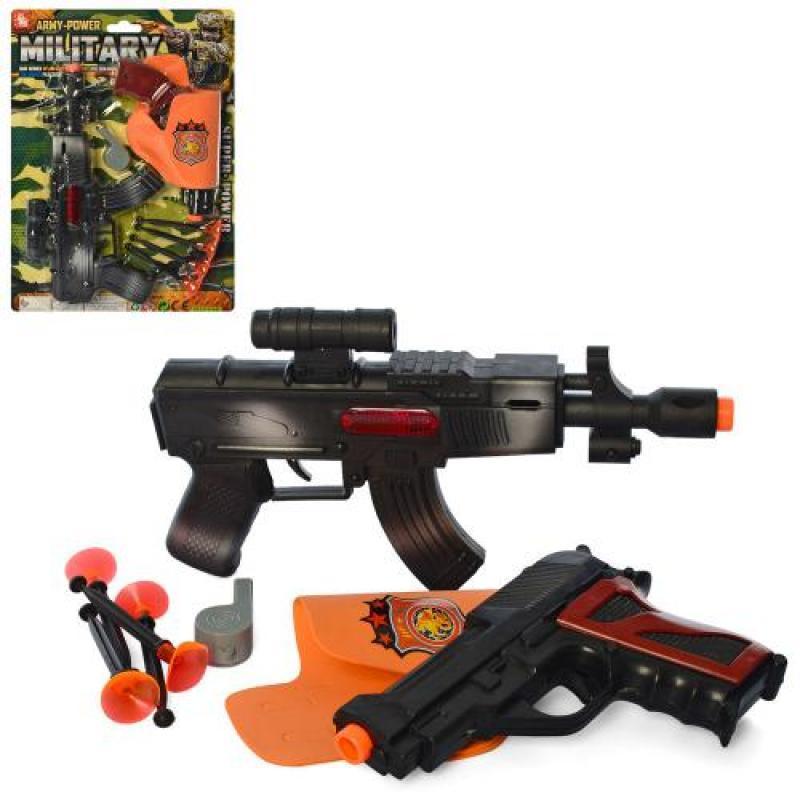 Набір зі зброєю "Поліцейський", 2 види. Пістолет, автомат, присоски в комплекті. Матеріал - пластик. Упаковка - лист. Розмір - 22х3х31 см.