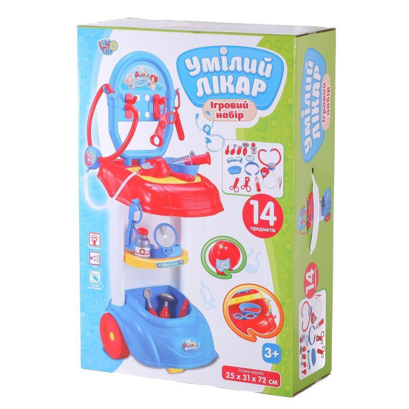Іграшковий набір "Умілий лікар". Комплектація - 14 предметів: візок, термометр, шприц, окуляри, молоточки та інші інструменти лікаря. Розмір візка - 25х31х72 см. Матеріали - пластик. Звукові ефекти, живлення від батарейок. Паковання — коробка. Розмір - 34х14,5х50 см.