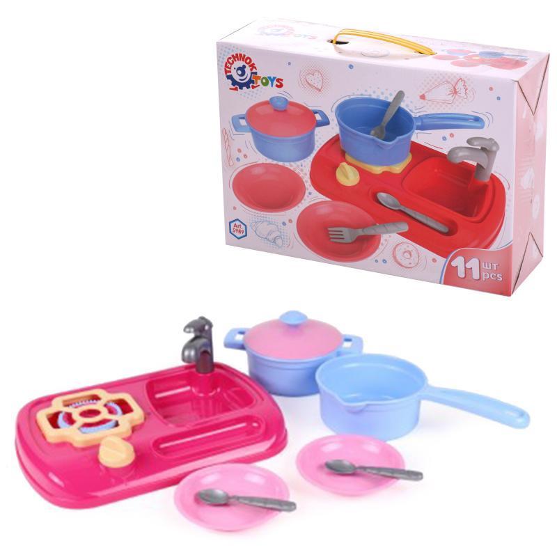 Іграшка "Кухня з набором посуду". Комплектація - плита та раковина, каструля, сотейник, тарілки та столові прибори. Матеріал - пластик. Упаковка - коробка. Розмір - 33х10,5х23 см.