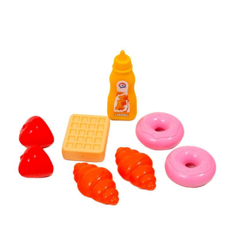 Іграшковий набір "Десерт" Комплектність - пончик - 2 шт., круасан - 2 шт., полуниця - 2 шт, пляшка, вафлі. Матеріал - пластик. Упаковка - сітка. Розмір - 13х13х13