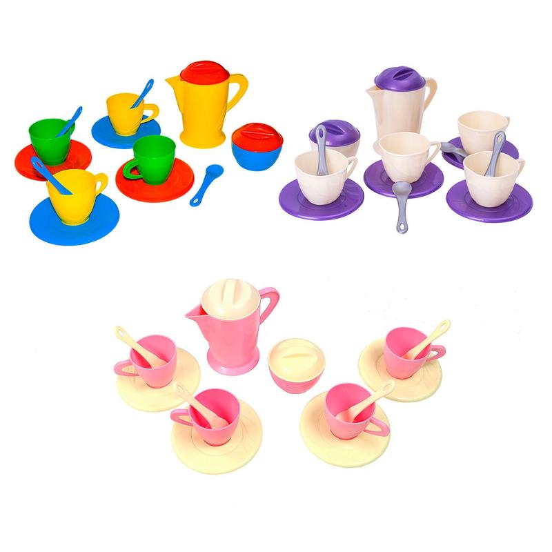 Чайний набір посуду виготовлений у яскравих тонах. Дитячий набір іграшкового посуду може використовуватися не тільки вдома, але й на вулиці в пісочниці або на пляжі, адже він виготовлений із високоякісної пластмаси, яку можна мити в теплій воді з милом. За допомогою ігрового набору посуду малюк зможе наробити купу кулірів і навіть побудувати замок. Комплектація: 1 чайник, 1 цукорниця, 4 чашки, 4 блюдця, 4 ложки.