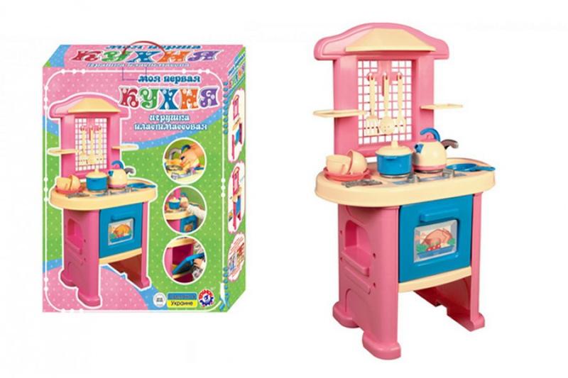 Популярная игрушечная кухня для маленьких хозяек. Набор игрушечной посуды позволит девочке почувствовать себя хозяйкой у плиты. В комплект, кроме самой кухни, входят также сковородка, кастрюля, 2 тарелки, 2 чашки, столовые приборы и чайник. Крышка духовки открывается и в неё можно положить посуду. Элементы игрушки в нежно-розовых и кремовых цветах.