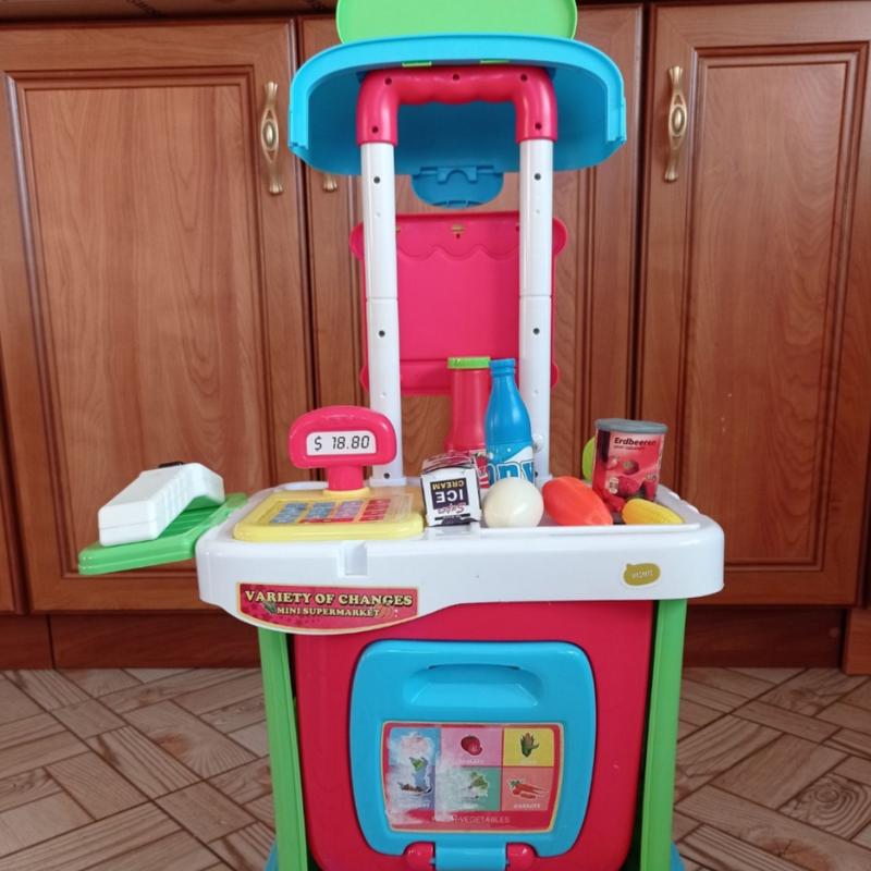 Продам игрушечный супермаркет, который трансформируется в багажную сумку на колесах.В набор входят продукты, их можно пробивать, устройство издает звук как на кассе.В сумке можно хранить все вещи, игрушки.Безврач идей игры для ребенка.