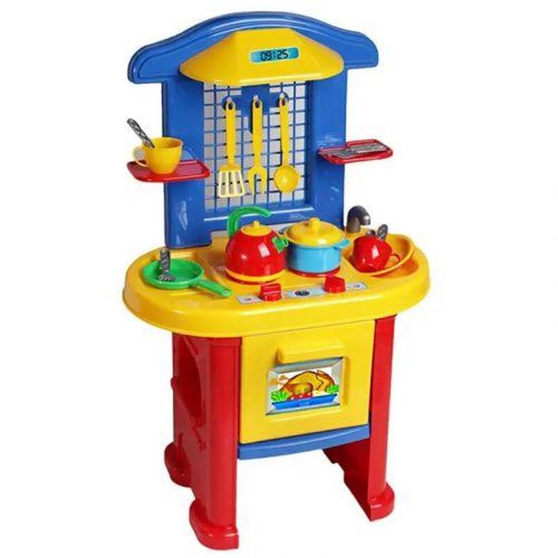 Пластикова кухня з відкривається духовкою, плитою на 2 конфорки і умивальником. Спеціальна стінка над плитою має кріплення - для того, щоб вішати на неї лопатки і 2 полички. У комплекті також є посудка: 4 приладу для готування, 2 чашечки, 2 тарілочки, сковорідка, чайник, 2 вилочки, 2 лоеечкі і 2 ножі, каструлька з кришечкою. Бренд: Технок Упаковка: Коробка Колір: Різнобарв'я Вага з упаковкою: 2189 г Габарити в упаковці: 57 x 48 x 15 см Габарити без упаковки: 57 x 48 x 15 см Країна виробник: Україна Матеріал: Пластик Комплектація: 28 шт
