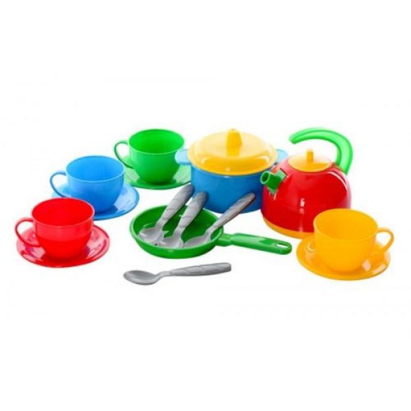 Набор яркой пластиковой посудки из 17 предметов. В комплекте: чайник с крышечкой, сковородка, кастрюля с крышечкой, 4 чашки, 4 блюдца и 4 чайных ложечки.