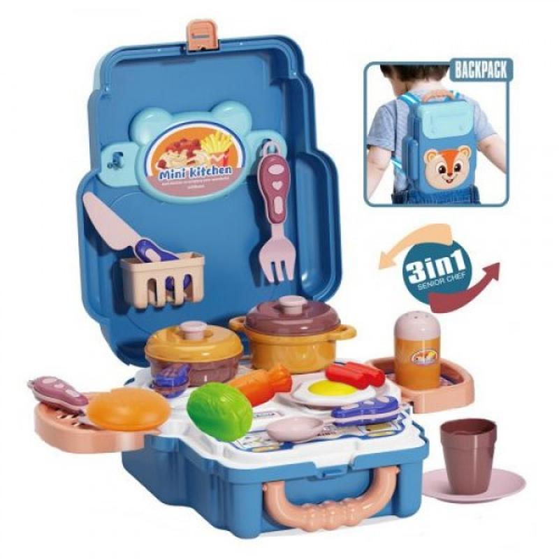 Игровой набор, который обязательно заинтересует маленького повара. В наборе есть игровые кухонные принадлежности (23 элемента) такие, как: столовые приборы, кастрюля, сковородка, 2 тарелки, стакан, продукты. С помощью специальных элементов, которые есть в наборе, рюкзак можно превратить в настоящую кухонную поверхность. В наборе так же есть тканевые шлейки для рюкзака. Набор предназначен для детей от 3-х лет.