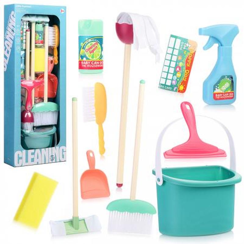 Час для прибирання! Цей дитячий іграшковий набір містить мініатюрну мітлу, совочок, лопатку, два засоби для чищення, губку. Цей набір дозволяє дітям під час гри відтворювати ситуації дорослих і вчить їх відповідальності та порядку - така іграшка сприяє розвитку дрібної моторики та розумінню важливості підтримання чистоти вдома. Набір має яскраві кольори та безпечні матеріали, щоб залучити й зацікавити малюків! Особливості: - досить реалістично відтворені атрибути; - іграшка допомогає показати дитині, як важливо прибирати вдома; - набір дозволяє дітям під час гри відтворювати ситуації дорослих і вчить їх відповідальності та порядку; - не містить шкідливих для здоров'я речовин. Розмір упаковки: 65 см × 10 см × 25 см