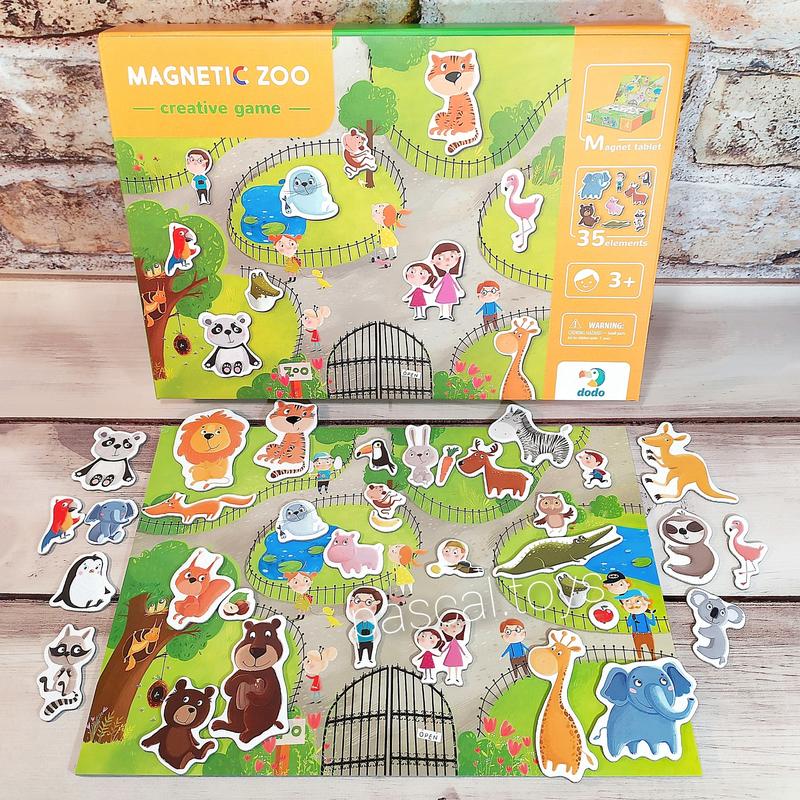 🕯️ Возраст: 3+ 🛍️ Комплектация: игровое поле, 36 магнита. 📏 Размеры: - игрового поля: 29,7*21*0,25 см; - фигурки: 🦘кенгуру 6,9*5,5*0,1 см; 🦁лев 6,4*4,6*0,1 см; 🍌банан 1,3*1,1*0,1 см; 🐇зайчик 4,9*2,4*0,1 см; 🦌лось 5*4,5*0,1 см. - коробки: 30,7*21,6*4,3 см. 🧰 Материал: картон, магнитный винил, полимерное железо. 🛠️ Производитель: Dodo.