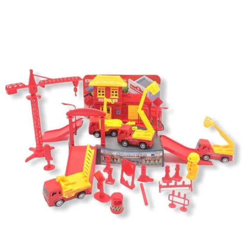Этот многофункциональный набор для сюжетно-ролевой игры представляет собой двухуровневый гараж. В набор входит пожарное депо с разметкой, башенный кран, 4 машинки, дорожные знаки. Играя с этим набором ребенок ознакомится с практически настоящей пожарной службой. Упаковка: 51х31х6 см.