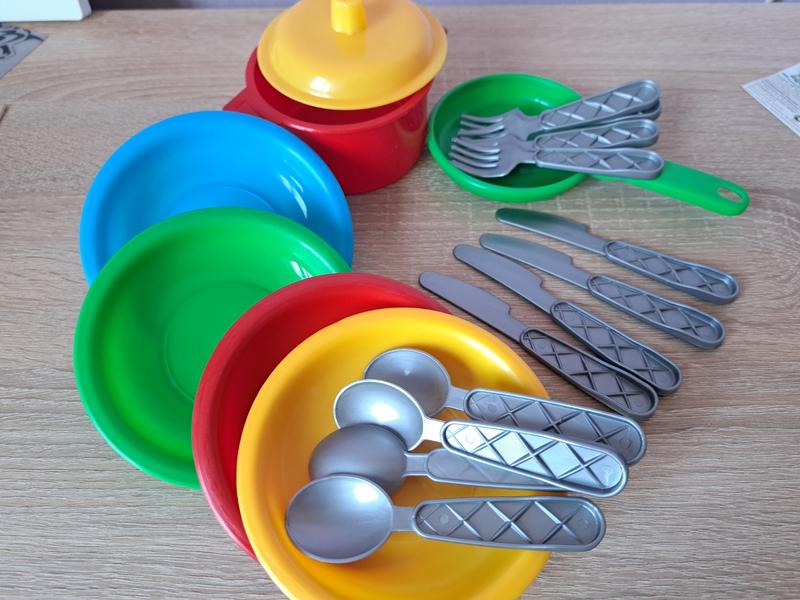 посуда Маринка изготовлена из прочного пластика без запаха и без острых краев. 19 элементов В наборе: кастрюля с крышкой, сковорода, 4 тарелка со столовыми приборами украинский производитель Технок
