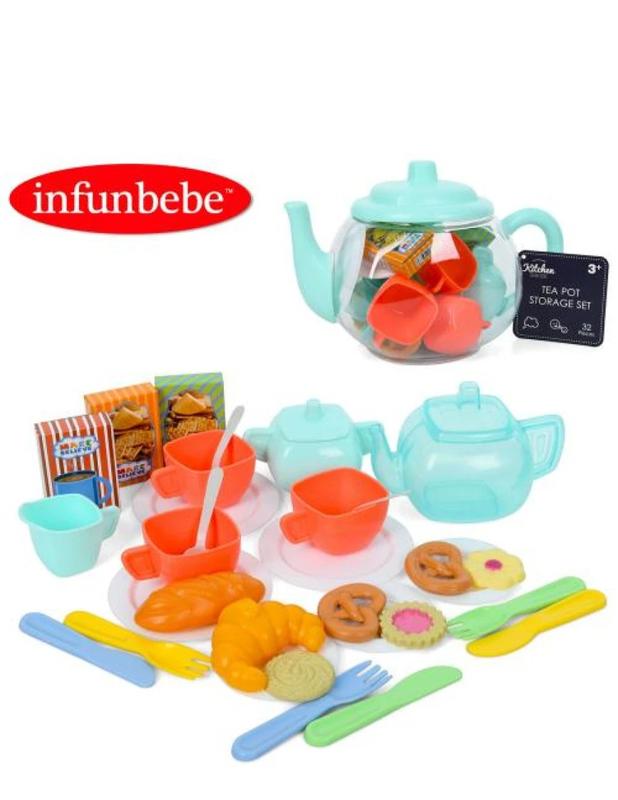 В комплект входят сладости, хлеб, круассан, различные виды печенья, чайник, посуда. Позволяет учиться серверировать стол Развивает воображение