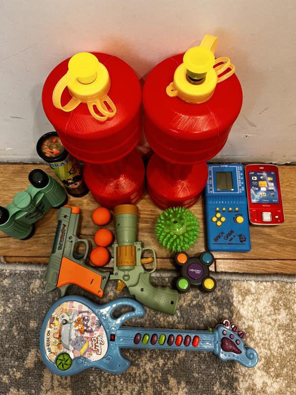 Продаж одним лотом. 2 пластмассовые гантели, гитара, 2 пистолета( один с 3 шариками),бинкль, мемори игра, мобильный телефон, тетрис, мячик с широкими светящийся, калейдоскоп