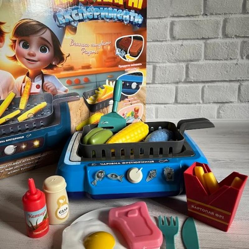 Игрушечная фритюрница/гриль подарит детям огромное пространство для игры, разнообразит не только реалистичным дизайном, но и невероятно интересным функционалом. Во время игры продукты будут менять цвет, имитируя процесс готовки. В наборе большое количество игровых элементов, чтобы маленькие повара имели возможность с головой погрузиться в увлекательную игру. Игрушка воспроизводит реалистичный процесс готовки в самых маленьких деталях. Она оснащена интерактивными кнопками и регулятором, позволяющим воспроизводить настоящие этапы кулинарного процесса и обогатить игровой опыт ребенка. Особенности: - подсветка кнопок на гриле; - звуковая имитация процесса приготовления; - прилагаются наклейки; - 13 аксессуаров среди которых фритюрница, тарелка, солонка, кетчуп, овощи, рыбина, мясо, яйцо, картофель фри, кухонные приборы; - плита работает от 4-х батареек типа АА 1.5V (не прилагаются); - набор способствует улучшению мелкой моторики, тактильному восприятию предметов, отлично развивает воображение, образное мышление, обогащает и расширяет фантазию. Размер упаковки 45*35*9 см