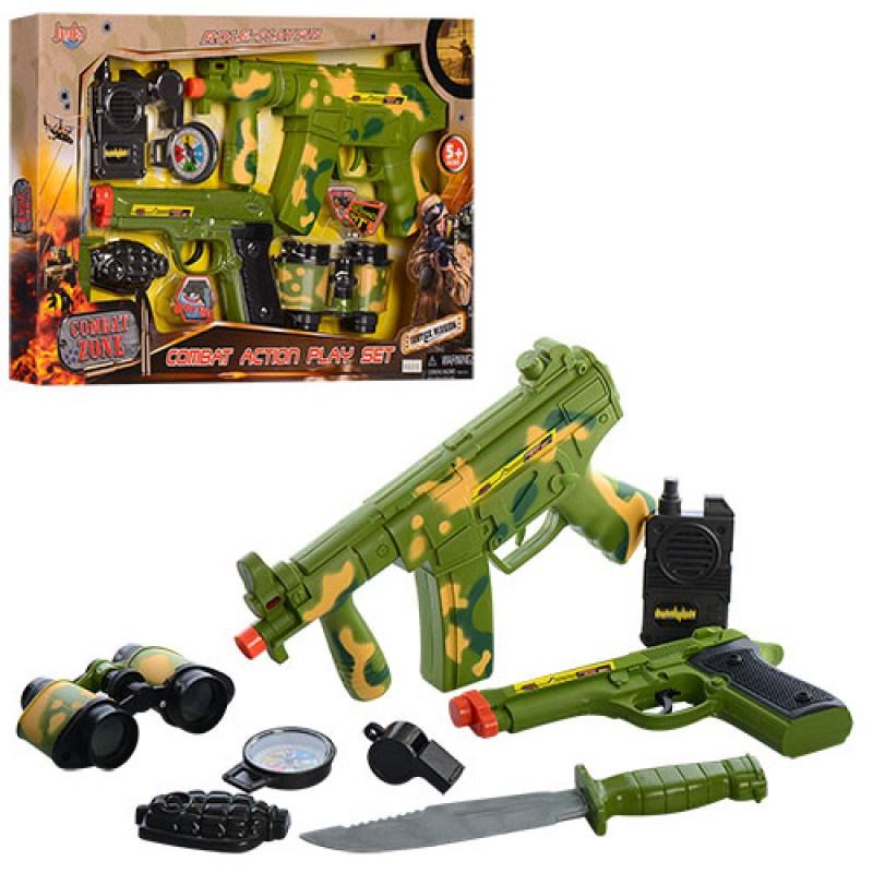 Игрушечный набор военного 8629 Артикул:8629 Комплектация: автомат 25,5см, пистолет 19см, бинокль, нож, компас. Особенности: свет, музыка. На батарейках, в коробке, габариты 45-30-4 см. Army Set