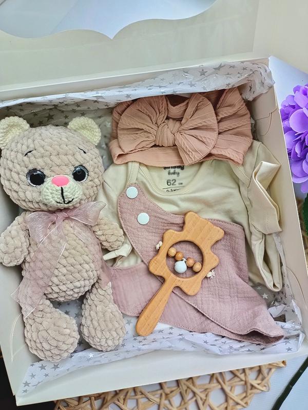 Бейбибокс детский набор в состав которого входит: ✅вязаный плюшевый мишка 24 см; ✅погремушка-грызунок деревянная; ✅муслиновый слюнявчик на кнопках; ✅повязочка с бантом на голову; ✅бодик с коротким рукавом на рост 62 см 🎁подарочная упаковка. Можно менять по желанию наполнения бокса добавлять или убирать какие-то из предметов. 🎁Идеальный подарок на babyshower, гендерпати, выписку, семьи, крестины и т.д. Можно использовать для красивых фотосессий. Не нужно ничего искать, все уже собрано в бокс😊 📝Пишите чтобы уточнить детали перед заказом, отвечая очень быстро. Подписывайтесь чтобы не потерять и хороших вам покупок💕