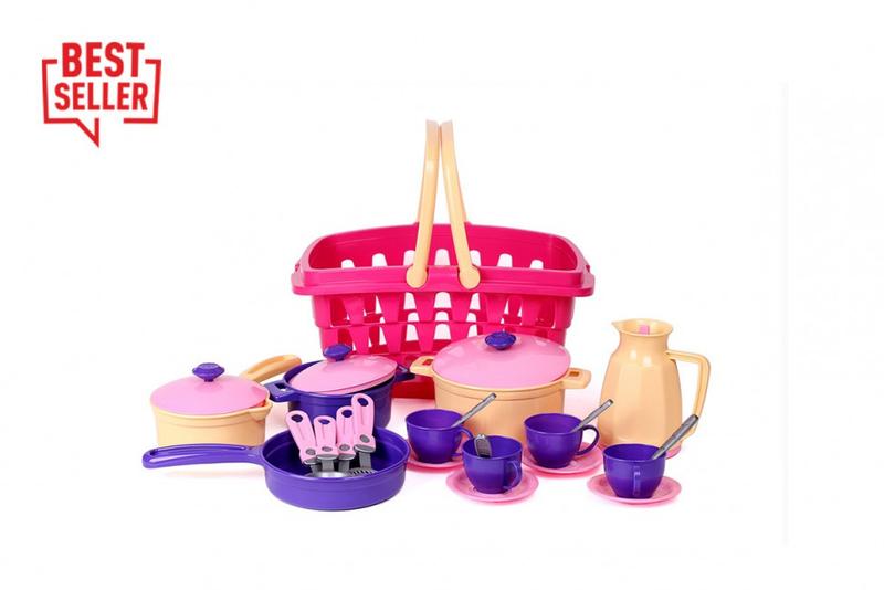 Особенностью этого набора является большая удобная корзина, в которую запакованные кастрюли, кофейник и другие кухонные принадлежности. Набор выполнен в яркой современной цветной гамме. Размеры посуды - диаметр дна большой кастрюли 140 мм, сотейника - 120 мм. Всего в комплекте - 26 элементов, среди которых кроме 2-х кастрюль разной высоты еще сковородка, сотейник, три крышки к ним, а также черпак, шумовка, большая поварская вилка и лопатка, кофейник, чашки с блюдцами и ложками. Размер упаковки: 34х27х17 см.