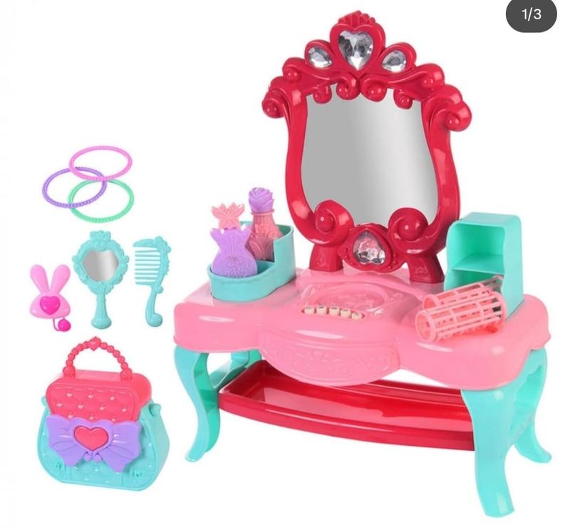 📍В комплект входят детали для столика и аксессуары: зеркало, сумка, зеркальце, расческа и прочее. В столе есть световые и звуковые эффекты. Для активации необходимо вставить две батарейки и нажимать кнопки. Выглядит очень мило и ярко, понравится ребенку. Изготовлено из качественных и безопасных материалов. Габариты в упаковке: 52 x 6.5 x 25 см