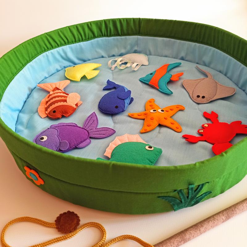 Текстильная игра "Рыбалка" на магнитах. Комплектация: - мягкое озерце (диаметр 40 см); - морские жители из фетра (10 шт); - удочка с магнитом.