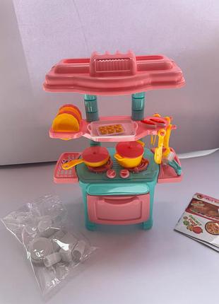 Дитяча кухня Це яскрава дитяча іграшкова кухня для сюжетно-рольових ігор. Вона складається з плити з духовкою, варильної поверхні з каструлями та сковорідкою, мийки, полиць і набору кухонного посуду. Верхня поличка вміщає тарілки, піднос з іграшковими яйцями, а також гачки для кухонного приладдя (лопатки, черпаки). До комплекту входить безліч аксесуарів: тарілки, чашки, каструлі, упаковки продуктів, а також наліпки для прикраси кухні. Кольорова гама — переважно рожевий, бірюзовий і жовтий. Ця іграшка чудово підходить для розвитку уяви, дрібної моторики та знайомства з побутовими предметами.
