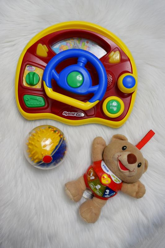 🍬В лоточку входят игрушки, что на фото 🍬Присутствующие следы игр 🍬Руль simba 🍬Мяч simba пластиковый, в середине шарика (пересыпаются, шуршат) 🍬Мишка vtech, англ.мешка 🍬Батерейки в комплект не входять