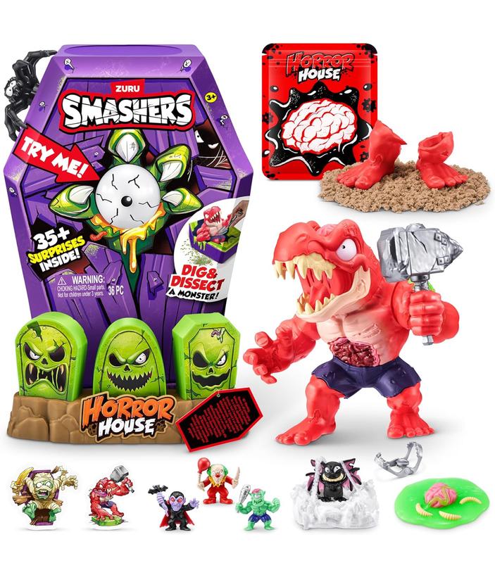 Ігровий набір Smashers Horror House-Large Dino для незабутніх пригод! Розбий, викопай та збери монстра, щоб оживити його. Знайди більше ніж 35 сюрпризів всередині! Чи вистачить тобі сміливості відкрити труну та викопати свого монстра? Збирай усіх монстрів і готуй їх до битви! Особливості: понад 35 сюрпризів у Smashers Mega Horror House; помісти око в голову свого монстра для активації моторошних світлових та звукових ефектів; візьми лопатку, щоб розкопати та оживити свого монстра; відкрий частини монстра, сховані у піску та слизі, для захоплюючої гри з тактильними ефектами.