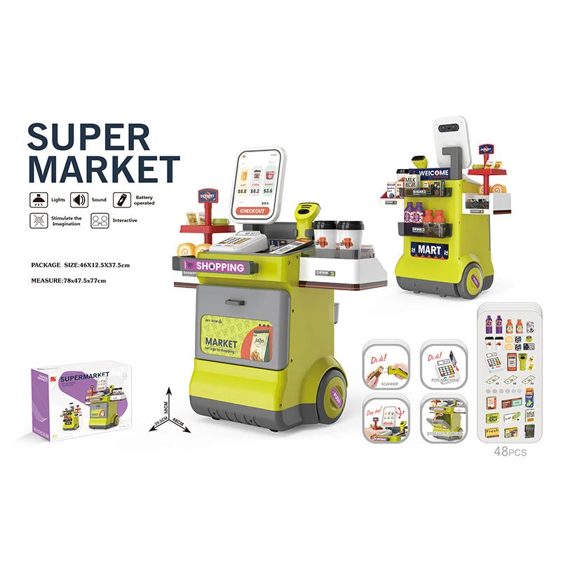 Этот маленький супермаркет расположен в самом сердце детского вымышленного мира. Его полки буквально заполнены игрушечными продуктами. Ассортимент способен поразить любого маленького гурмана: яркие игрушечные десерты и йогурты, газированные напитки и соки. Здесь найдется даже кофемашина для ценителей ароматного горячего напитка. Игрушечная касса оснащена полками для продуктов, корзиной для покупок и даже игрушечными деньгами и кредитными картами. Дети могут создавать собственные сценарии и игровые ситуации. Кассовый аппарат оснащен разнообразными функциями, которые обеспечат детям увлекательный и увлекательный процесс игры. Ребенок сможет сканировать продукты с помощью сканера, который воспроизводит звуковые эффекты и световые сигналы. Особенности: - сканер воспроизводит звуковые эффекты и световые сигналы; - имитация расчета карточкой; - стойкая магазина дополнительно оснащена кофемашиной; - в комплекте представлены игрушечные банкноты, карточка и продукты; - сканер работает от 2-х батареек типа “АА” (не прилагаются); - кассовый аппарат выполнен в ярких цветах с использованием безопасных материалов и работает от 2-х батареек типа “АА” (не прилагаются); - дверца холодильника открывается; - игровой супермаркет имеет компактную конструкцию, идеально подходящую для маленьких ручек; - функционал аппарата легко понять даже самым маленьким.