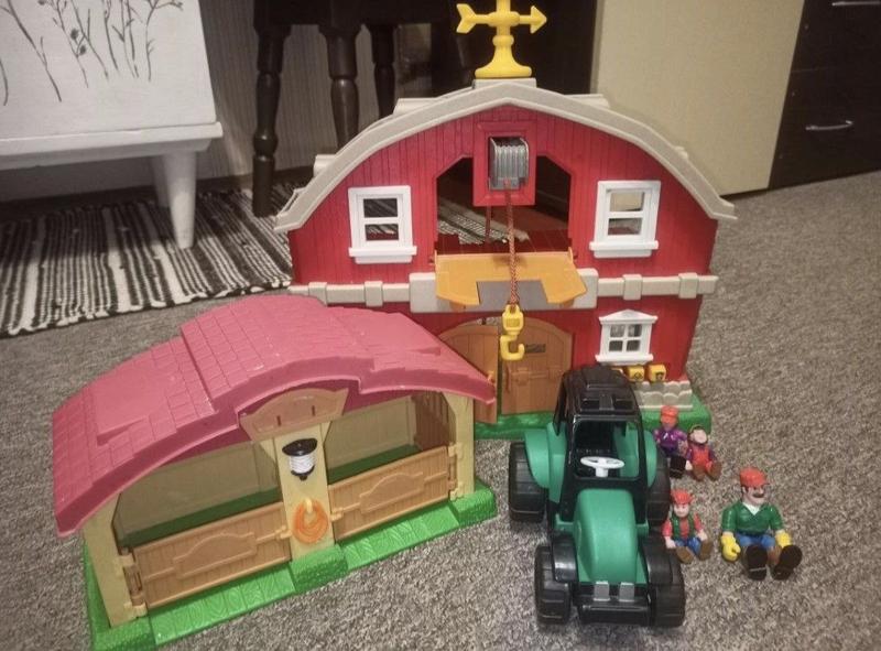 Продам ферму - 1 будиночок високий,висота 28 см, ширина 36 см.В будиночку відкриваються двері,є механізм опускання піднімання вантажу і механізм видання звуків тварин на кнопках ( 2 батарейки АА, продаю без них). 2 будиночок - висота 16 см,ширина 25 см, відкриваються двері. Також в комплекті трактор і люди . Ціна 2 будиночків 1000 грн. Якщо з трактором ,то 1150 грн, + люди 1300 грн все разом. Люба пошта.