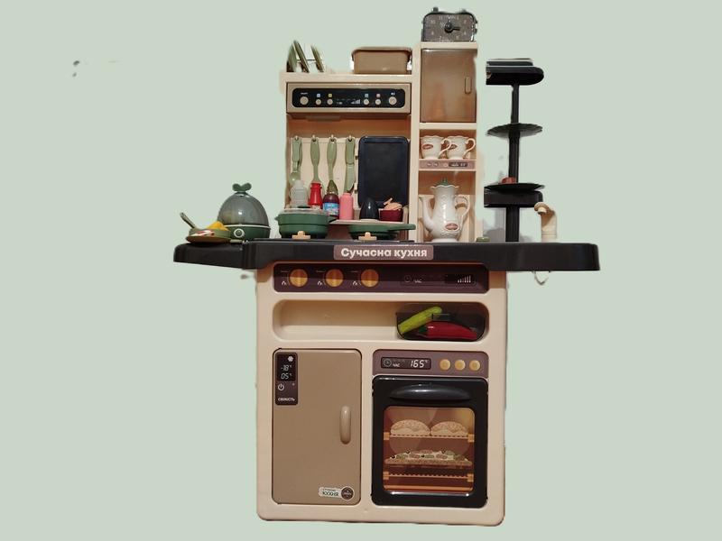 Отличный игровой набор "Сувременная кухня" от качественного производителя "TK Union Group" полностью оснащен всем необходимым для приготовления настоящих кулинарных шедевров. Кухня представляет собой устойчивый игровой столик оснащен вытяжкой, поверхностью с двумя конфорками и мойкой с помповой накачкой воды. Также кухонный гарнитур оснащен компактными полками для хранения посуды и продуктов. Варочная панель оснащена двумя конфорками, при включении имитируют звуки варки, жарки и кипения, со световыми эффектами горящего газа. Если набрать воду в мерную бутылочку для кетчупа (входит в комплект) и залить в специальное отверстие конфорки, то из нее уйдет пар. Размеры / габариты - Длина (см): - 70 см - Ширина (см): - 27 см - Высота (см): - 91 см Ефекти плити: - парогенератор; - подсветки конфорок; - звуки: жарка, варка и кипение воды. Музыкальная панель с 6 функциональными кнопками, которые при нажатии активируют яркую подсветку и воспалительные мелодии. Эффекты вытяжки: - яркая разноцветная подсветка - веселые мелодии; - регулировка громкости; - звук вытяжки. В игровой набор входит вся необходимая кухонная утварь, посуда, разнообразие продуктов, овощи на липучках, функциональная яйцеварка и компактная дощечка, на которой можно записывать самые любимые рецепты. Эффекты обзора новых: - разноцветная подсветка; - вращение лотка; - звуки кипения; Комплектация: - игровые элементы кухни; - овощи на липучках; - продукти; - яйцеварка; - кухонные принадлежности и посуда; - дощечка для рисования; Звуковые и световые эффекты варочной панели работают от 3-х батареек типа "АА" — в комплект входят. Звуковые и световые эффекты вытяжки работают от 3-х батареек типа "АА" - в комплект входят. Звуковые и световые эффекты обзора новых работают от 2-х батареек типа "АА" - в комплект входят. Некоторые игрушки в наборе кухоньки имеют повреждения: - не хватает одно печенье, один кусок шоколадки. - поломана ложка. - на яйцо варке зажата кнопка и постоянно работает.