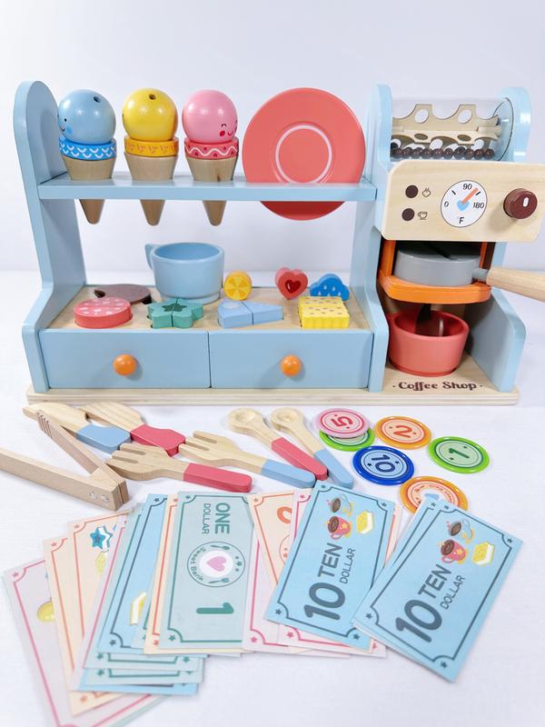Крутий сучасний варіант подарунку для захопливої сюжетно-рольової гри з дитиною. Можна заварювати каву, робити морозиво, смаколики і все це продавати. У набір входить також меню та іграшкові гроші. Іграшка із дерева, повністю безпечна для малюка та довкілля. Кольори: рожевий, блакитний. Розмір кафе: 36,5*21*13 см. Розмір в коробці: 40,6*25*16 см.