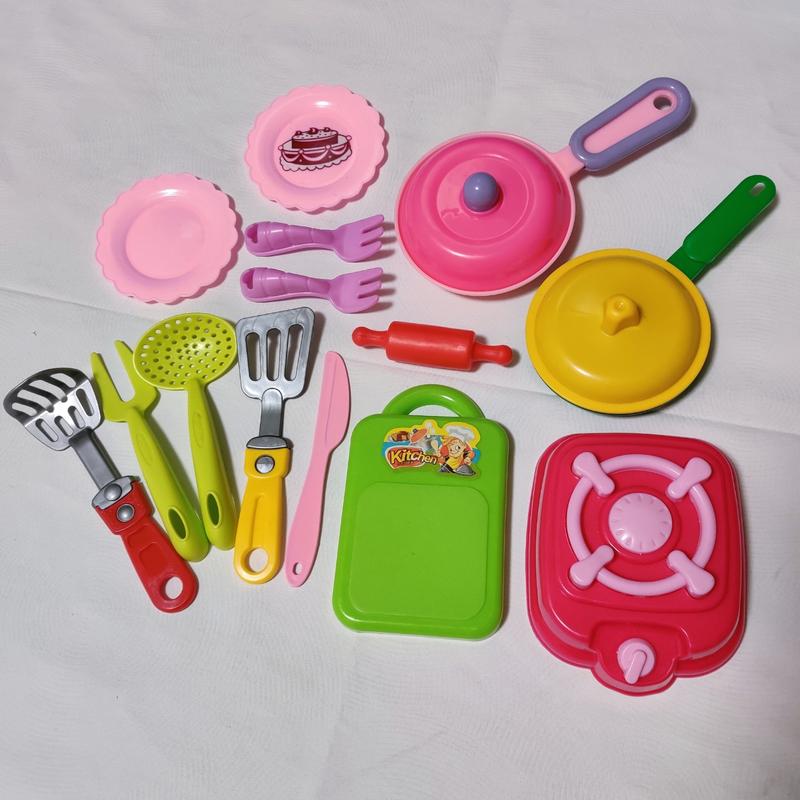 Комплект іграшкового посуду, Плита на одну комфорку, дві сковорідки з кришками, дві тарілочки, дві виделки, дошка для нарізання, ніж, качалка для тіста, лопатка, друшляк, вили та товкучка для пюре Стан відмінний 130 грн за все