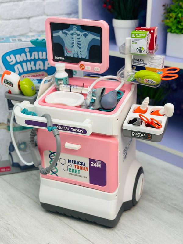 🧑⚕️ Детский игровой набор доктора на 32 предмета 👩⚕️ Артикул:2562 💫 Интерактивный дисплей: Монитор рентгеновского просмотра и ЭКГ с имитацией показателей добавляет реализма 💫 Включает широкий ассортимент медицинских и стоматологических инструментов 🦷 💫 Подсветка и звуковые эффекты от батарейок Игровой набор помогает детям развивать мелкую моторику, воображение, коммуникативные навыки и понимание важности профессий врача и стоматолога. 🤍Все аксессуары легко размещаются на тележке, а колесики позволяет ребенку передвигать свой "кабинет" куда угодно. Этот интерактивный комплект станет идеальным подарком маленьким врачам и стоматологам, стимулируя их воображение и развивая социальные навыки. ⬆️⬇️Размеры 46,5-26,5-115 см