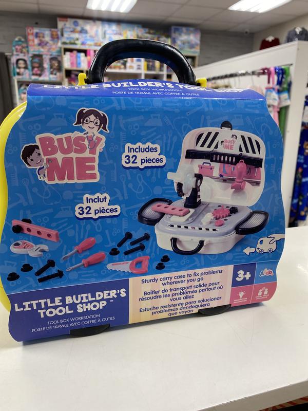 Набір містить 32 предмети. • У комплект входять іграшкові інструменти: викрутки, болтики, пилка, ключі, планки з отворами та інші деталі. • Валізка трансформується в маленький верстат/робоче місце. • Розрахований для дітей від 3 років. • Дизайн у рожево-білому кольорі. • Є ручка, щоб зручно носити як чемоданчик.