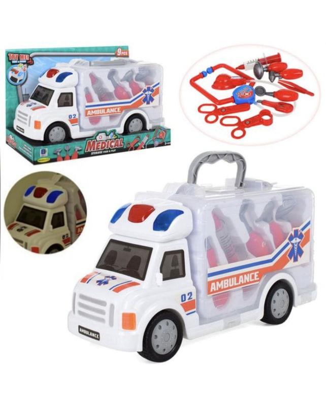 Игровой набор – это яркая машинка в виде быстрой помощи с медицинскими аксессуарами внутри. Она оснащена световыми и звуковыми эффектами, работает от батареек. В комплекте — стетоскоп, шприц, термометр и другие инструменты. Все элементы изготовлены из безопасного и прочного пластика. Игрушка способствует развитию воображения, мелкой моторики и интереса к медицинской тематике. Размер упаковки: примерно 35 × 23 × 14,5 см Возраст: от 3 лет.