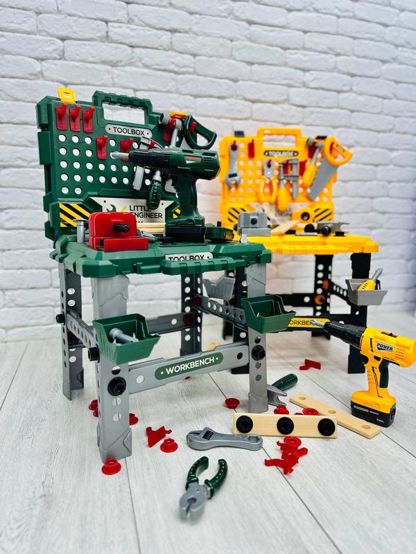 Головною особливістю набору є валіза, яка трансформується у робочий простір До набору входять різні інструменти, в тому числі і дриль з насадками, який працює від батарейок. Кількість ігрових елементів дозволять хлопчику відчути себе справжнім майстром та ознайомитись з принципами роботи різних інструментів. Шуропокрут працює від 2 батарейок типу АА (до комплекту не входять) розмір валізи - 41х11х39 см; розмір робочого простору - 41х39х71 см