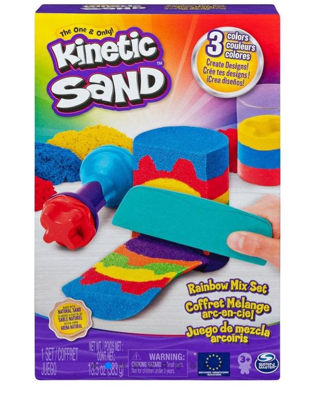 Набор песка для детского творчества Kinetic Sand Радужный микс содержит все необходимое для смешивания и создания цветов радуги. У комплекті: 3 основных цвета кинетического песка (по 127.6 г красного, желтого и синего цветного песка), из которых путем смешивания можно создать другие цвета Инструменты для творчества: 3 формы в виде замка, прозрачная цилиндрическая форма для заполнения, пресс с 4 насадками различной формы и слайсер Смешивайте новые цвета, с помощью пресса с разными насадками заполняйте форму и создавайте фантастические узоры. Кинетический песок изготовлен из экологически чистых материалов – песка (98%) и специального связующего материала (2%), который создан для большей пластичности. Песок благотворно влияет на развитие детской психики, снимает стресс, успокаивает. Игра с Kinetic Sand развивает воображение, мелкую моторику, творческие навыки, кругозор. Особенности кинетического песка Kinetic Sand: После игры все поверхности остаются абсолютно чистыми Не растворяется в воде Является неблагоприятной средой для размножения бактерий Не вызывает аллергии и абсолютно безопасен Играйте с песком в любое время в любом месте, создавайте радужные узоры с набором Kinetic Sand Радужный микс. Рекомендовано для детей: от 3 лет