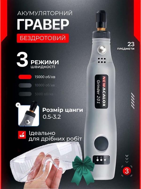 Аккумуляторный ручной гравер NEWAcalox201 с набором насадок + Подарок Защитные очки (Прозрачные) Подарок к каждому Граверу - Защитные прозрачные очки! Аккумуляторный гравер New Acalox 201 компактный и удобный инструмент для мелких работ по гравировке, полировке, шлифовке, сверлению и резьбе. Благодаря встроенному аккумулятору вам больше не нужно привязываться к розетке. Гравер позволяет работать в любом месте без лишних проводов и ограничений. Заряжайте устройство от павербанка, ноутбука, адаптера или автомобильного зарядного устройства. В набор входят разные насадки, позволяющие обрабатывать различные материалы и выполнять тонкую, точную работу без дополнительных затрат на аксессуары. Оптимальная мощность обеспечивает стабильную производительность и позволяет обрабатывать даже жесткие материалы. Преимущества: - Три режима работы; - Комплект различных насадок в наборе; - Удобная зарядка через USB; - Позволяет выполнять точные и деликатные работы; - Беспроводная работа; - Универсальность применения Характеристики: - Материал: АБС-пластик; - Материалы для работы: дерево, металл, пластик, стекло, керамика; - Номинальная потребляемая мощность: 12 Вт; - Питание: встроенный аккумулятор; - Тип заряда: USB; - Диаметр цангового патрона: 0,5-3,2 мм; - Скорость вращения: 5000/10000/15000 об/мин; - Входное напряжение: DC 5V USB; - Цвет: серый Комплектация: - Аккумуляторный гравер; - USB кабель; - Зажимная оправка 1 шт; - Резиновое колесо 1 шт; - Нарезной стержень 1 шт; - Пильный дискmdash;1 шт; - Алмазная шлифовальная игла - 2 шт; - Шерстяной полировальной цепи - 2 шт; - Круг наждачной бумаги 3 шт.; - Спиральные сверла - 3 шт; - Головка для шлифования круга 5 шт; - Цанга для электрических дрелей - 6 шт; - Кейс для хранения насадок 12 Причин Почему покупатели выбирают у нас? 1) Отправим Ваш заказ удобным для вас способом Новой почтой или Укрпочтой 2) Надежность - работаем с 2013 года 3) Официальный сайт ************** 4) Отправляем и в связи с Вами по пн-пт (с 10-00 до 22-00) 5) Низкие цены – благодаря работе непосредственно с производителями и низкой наценке 6) Гарантированные отправки каждый день, при оформлении заказа до 12-00 7) Дополнительная проверка каждого товара перед отправкой 8) Оплата любым удобным для Вас способом: наложенный платеж, Пром-оплата, предоплата 9) Быстрая доставка по Украине 1-2 дня 10) Гарантии на весь ассортимент 11) БЕСПЛАТНАЯ доставка на заказ от 2500 грн 12) Более 1000 положительных отзывов и в 10 раз больше успешно завершенных покупок