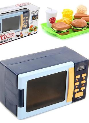 Чудовий набір для захоплюючих сюжетно - рольових ігор. Іграшка оформлено в яскравій колірній гамі, стильному і реалістичному дизайні, володіє звуковими і світловими ефектами. В комплект входять мікрохвильова піч, піднос, 2 тарілки, кухонні інструменти, яєчня, попкорн, картоплі фрі, сендвіч, курочка, котлета, напій, набір наклейок. Функціонал мікрохвильовій печі: дверцята відкривається з характерним звуком, дисплей підсвічується, на панелі керування вибираємо програму, натискаємо на кнопку старту, мікрохвильова піч починає видавати звуки роботи цієї техніки, відсік для розігріву підсвічується, можна збільшувати і зменшувати кількість часу. Працює від 3 батарейок типу АА (не входять в комплект). Розмір мікрохвильовій печі 21 * 11 * 12 див. Розмір коробки 30 * 12 * 17 див.