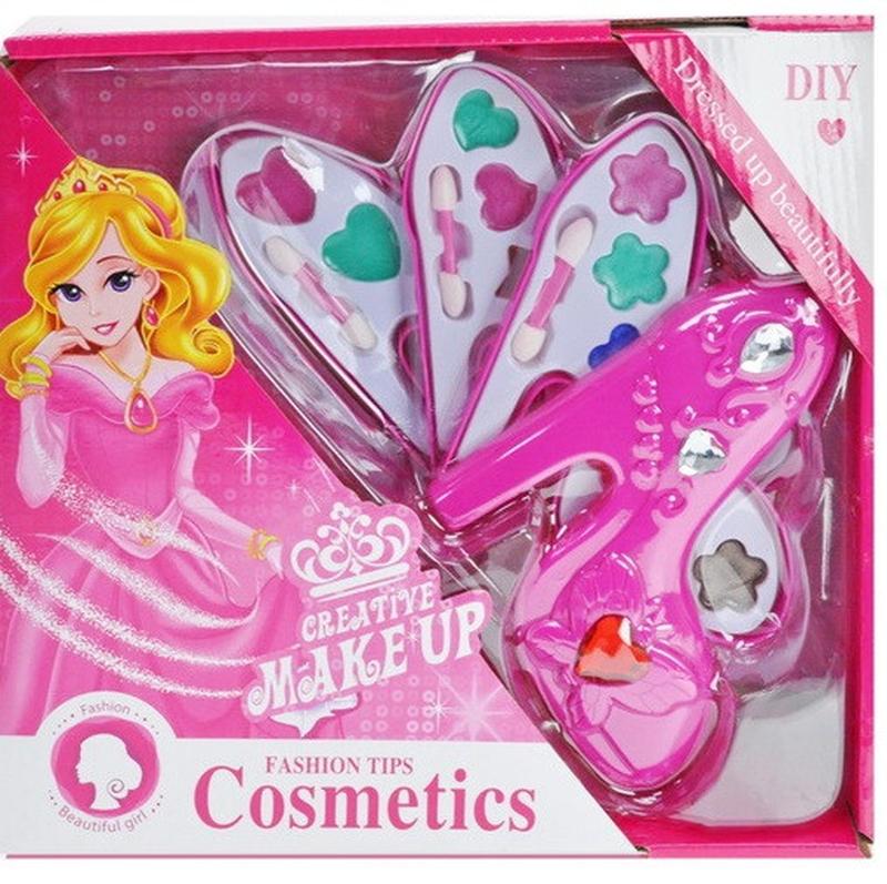 Игрушечная Косметика в виде 3-х ярусной палетки в форме туфельки. На палетках расположены наборы ярких разноцветных теней и 2 двухсторонние кисточки. Косметика нетоксична и безопасна для детей. Размер коробки 26*8*24 см