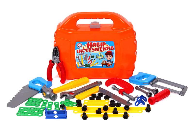 Іграшка доповнює «класичний» набір інструментів з набору арт. 4371 (молоток, пилочки, викрутки, плоскогубці та ін.) елементами конструктора, а саме: пластикові планки, кутники, пластини, болти та гайки. Це чудова нагода для малюка вивчити принципи роботи різьбових з'єднань, що безумовно стане в нагоді у «дорослому» житті. В комплекті: - плоскогубці, - кутник, - молоток, - пилка по металу, - пилка по дереву, - струбцина, - розвідний ключ, - викрутка з двома насадками, - болти та гайки по 10 шт., - планки - 10 шт., - пластини - 2 шт., - кутники - 2 шт. та 2-і скоби.