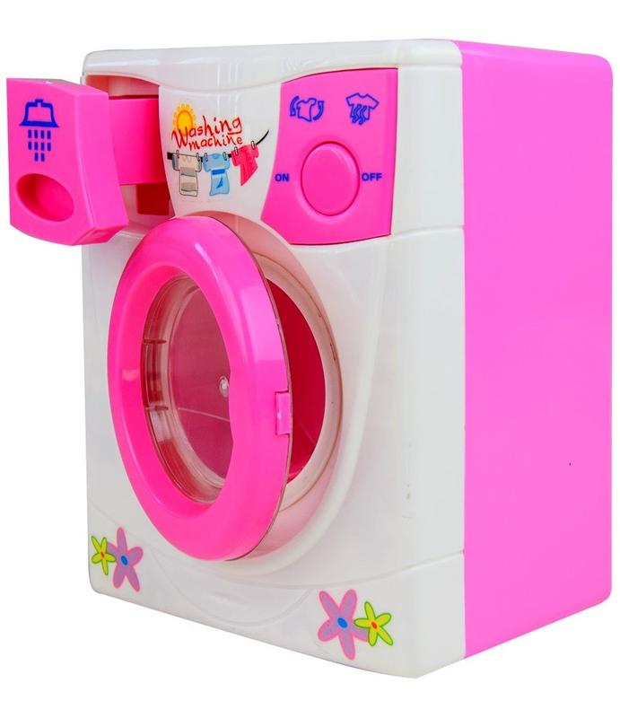 Детская стиральная машина станет любимой игрушкой и отличным подарком для девочки. Маленькая хозяюшка сможет стирать свои вещички и следит за чистотой одежды любимых кукол. Она работает почти также, как настоящая стиральная машина. Загрузите в барабан бельё, залейте в специальное отделение воду и просто нажми на Пуск. В стиральной машинке крутится барабан, есть отсек для воды, шланг для сливы воды и в комплекте 2 вешалки. А также реалистичный звук, световые эффекты. Работает от 2 батареек типа АА (в комплект не входит). Размер стиральной машинки 15 * 11 * 20 см. Размер коробки 20 * 14 * 22 см.