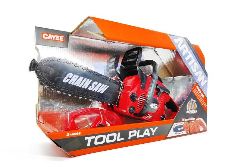 Детская бензопила работает от двух батареек АА (в набор не входят). при включении начинает вращаться цепь на пиле, имитируя настоящую. Размер: 41 см