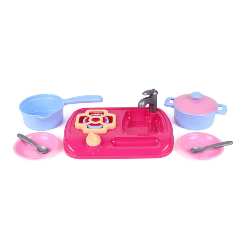 В новой кухне есть все самое необходимое для маленьких поваров. На поверхности с газовой конфоркой можно приготовить вкусные блюда для игрушечных друзей. Для этого в наборе есть большая кастрюля с крышкой, сотейник, тарелки, ложки и вилки. А после праздничного обеда надо помыть посуду. Это можно сделать в игрушечной мойке с краном и подвижной ручкой. Игрушечная кухня с набором посуды - является прекрасным подарком для всех детей. С такой игрушкой маленькие повара могут играть на настоящей кухне и помогать маме. Такие игры хорошо развивают моторику и детское воображение. Набор продается в яркой коробке с ручкой, за которую его удобно переносить. В наборе: столешница кухонная, кран, кастрюля, сотейник, крышка, ложки, вилки и тарелки по 2 шт. Игрушка для детей от 3-х лет. Размер упаковки: 33х23х10,5 см.