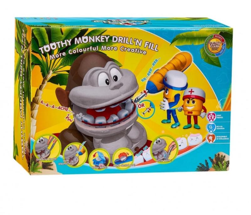 Набор для лепки "Стоматолог обезьянки" В комплекте : обезьянка(работает от 2х батареек типа АА), дрель( работает от батарейки типа АА), 2 зуба, 5 инструментов, 2 формы для лепки зубов, 4 баночки массы для лепки с формочкой. Батарейки в комплект не входят. В коробке 27,5-21,5-6,5 см