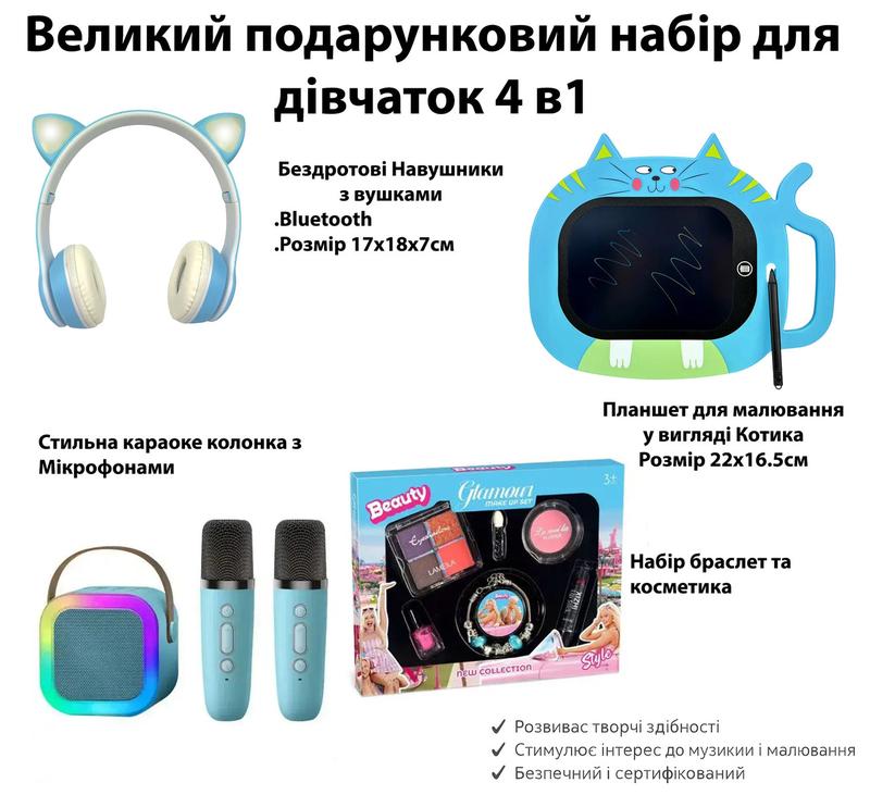 🎁 Большой подарочный набор для девочек 4 в 1 Яркий подарок для девочек, который объединяет музыку, творчество и стиль. Благодаря разнообразию набора ребёнок сможет петь, рисовать и экспериментировать с образом. 📦 В комплект входит: Беспроводные наушники с ушками Подключение: Bluetooth Размер: 17×18×7 см Стильный дизайн с кошачьими ушками Планшет для рисования в виде котика Размер: 22×16.5 см Лёгкий и удобный Подходит для зарисовок, игр и развития воображения Стильная караоке колонка с двумя микрофонами Поддержка Bluetooth/USB Компактная и портативная Два микрофона в комплекте — для пения дуэтом Набор браслет и косметика Детский набор косметики (тени, блеск, румяна) Стильный браслет в подарок Безопасные материалы для детей ✅ Преимущества набора: Развивает творческие способности Стимулирует интерес к музыке и рисованию Позволяет петь вместе с друзьями Сертифицированные и безопасные материалы