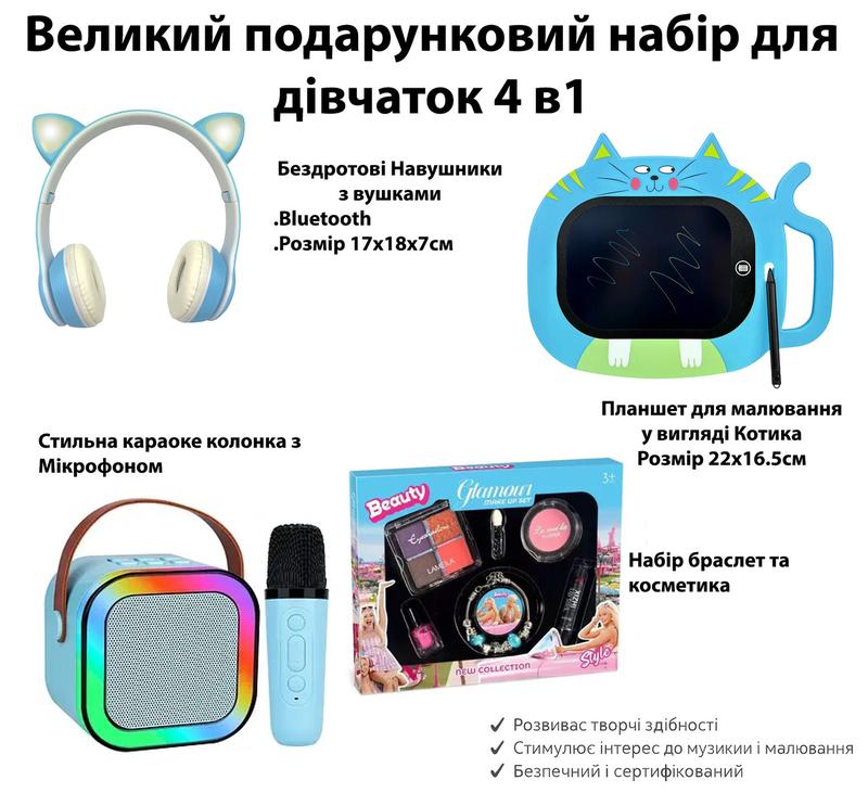 Большой подарочный набор для девочек 4 в 1 наушники, караоке с микрофоном, планшет, космет...
